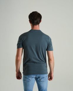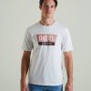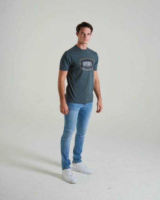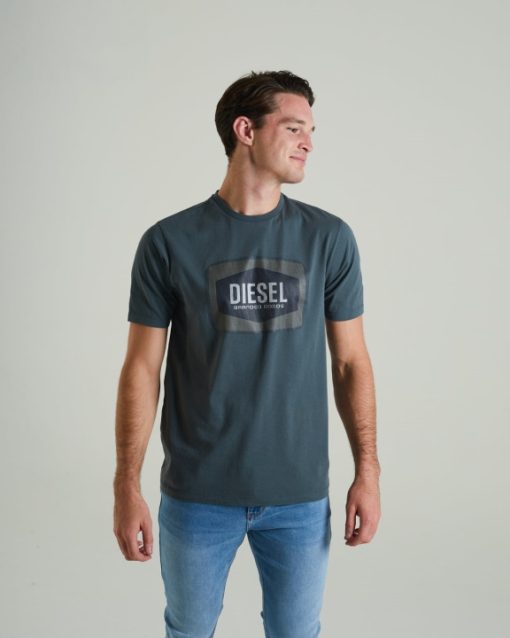 חולצת טריקו ג’רזי מכותנה לגברים עם יצירות אמנות מודפסות בדיו דיזל קלאסיות שלנו ותווית דגל ארוגה ליד המכפלת.