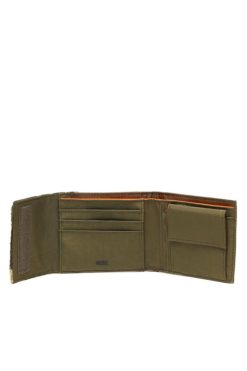 ארנק דו-קיפול עם סגירת סקוטש ורצועת צוואר נסוגה. הוא עשוי עמיד, מזויף חיפוי גזירה ותיקון לוגו גומי.