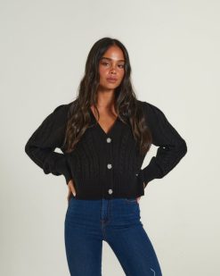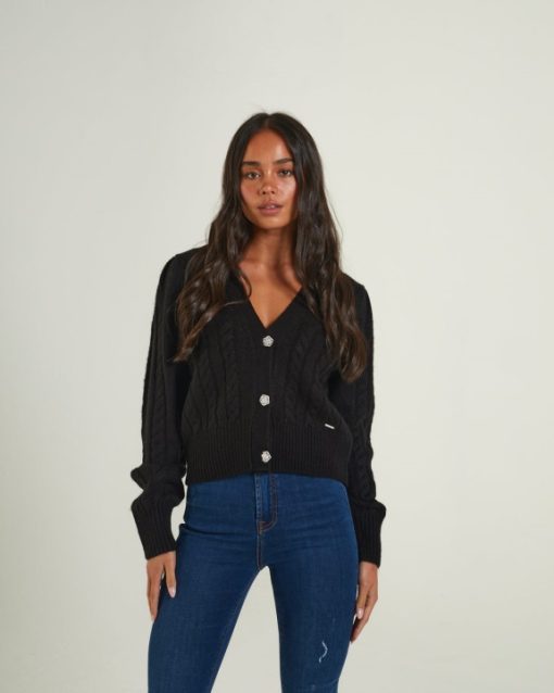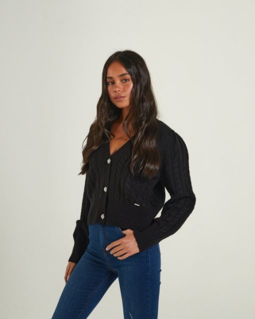 קרדיגן סרוג בכבלים רך במיוחד עם ראש שרוולים אסוף, דפוס עיניים בגב העליון ושלושה כפתורים נוצים. סיים עם תג מתכת דיזל מעל המכפלת.