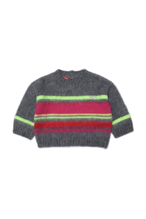המגשר הזה לבנות סרוג מתערובת אנג מטושטשת ואלה. כולל פסים צבעוניים בהירים על רקע אפור, הוא מפורט עם לוח D מתכתי על החזה.