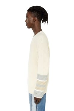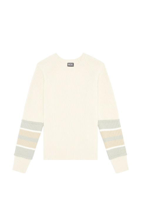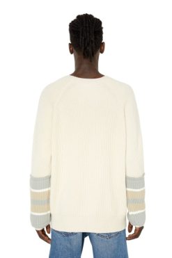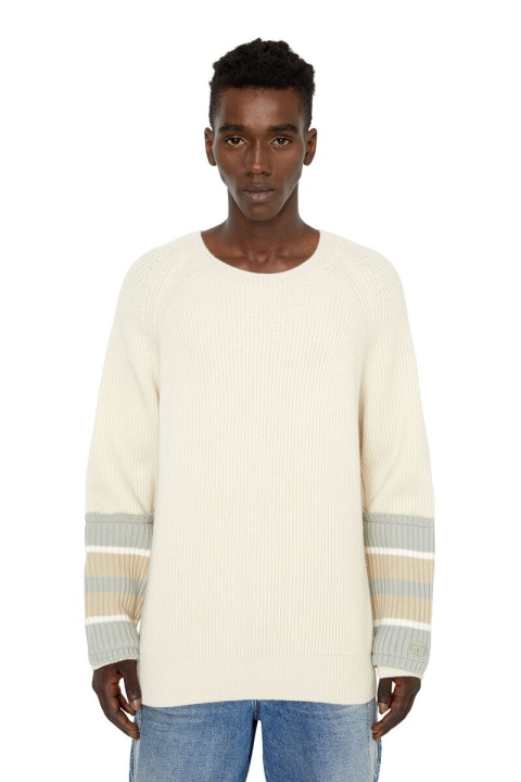 מגשר לגברים עם צללית ראגלן בגזרה רגילה, עשוי צמר שמקורו באחריות. כיסויי סריג הצלעות המפוספסים על האמות מקזזים את עיצוב הצלעות הפשוט.