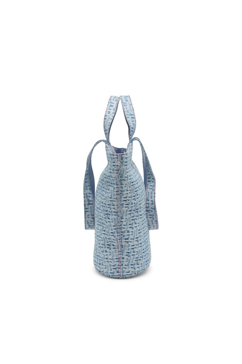 תיק לגברים FW Runway Show Collection ’22 עשוי מג’ינס לוגו-אקארד בגוון תכלת. התיק הזה מציג לוגו מורם ומודגש בבסיס הסגלגל, עם עיטורי עור ותפרים אדומים ניגודיים. דגל לוגו האייקוני מהג’ינס של דיזל מדגיש את הפנים.