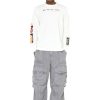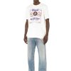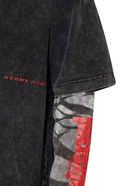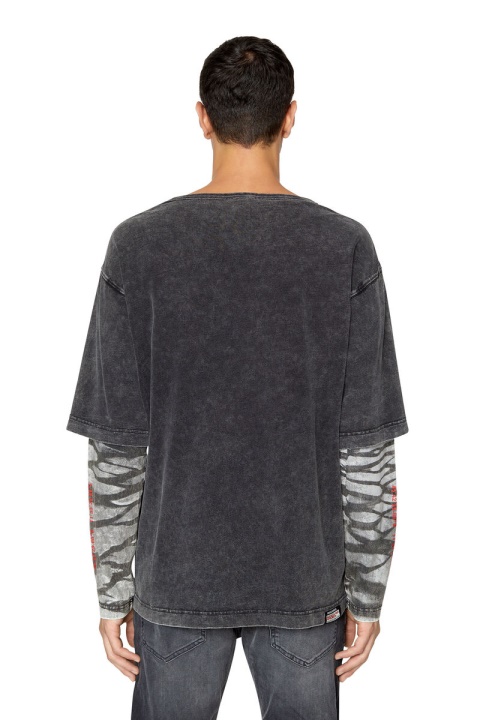חולצת טריקו לגברים בג’רסי כותנה באפקט שיש, בגזרת אוברסייז ושרוולים באפקט שכבות. הארוכים יותר מודפסים עם דוגמה גרפית ואותיות ‘דיזל אוניברסליות’ מנוגדות.