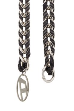 חלק מקולקציית תצוגות האופנה SS22, חגורת מתכת מבריקה זו נטולת ניקל שזורה ביד עם ג’ינס שטוף אבן. ממותג עם לוח לוגו סגלגל מצופה באמייל ‘D’.