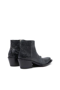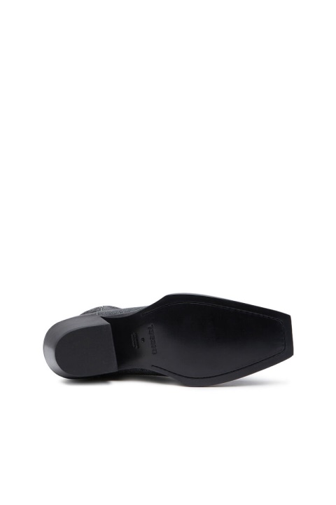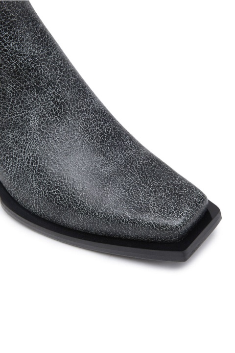 מגפונים לגברים עם חלק עליון מעור פצפוץ, חלק מקולקציית FW Runway Show ’22. נעל זו ממוקמת על עקב קובני שמנמן ויש לה אצבע מרובעת זוויתית.