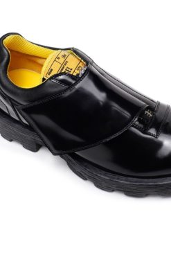 נעלי גברים אלה ננעלות עם רוכסן קדמי ורצועת נזיר, מעוצבות מעור מבריק לעומת תיקון הלשון הבהיר והפנים. סוליית זיז הגומי השמנמנה היא פרשנות מודרנית של עיצוב ארכיוני.