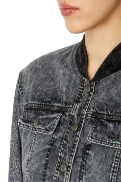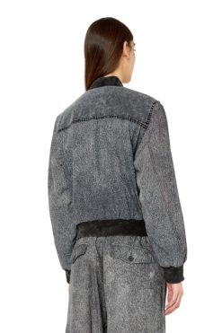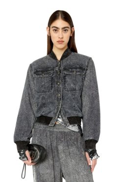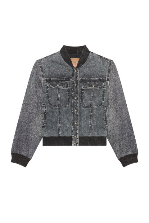 ז’קט בומבר לנשים זה משתמש ב-trompe L’oeil כדי לדמיין מחדש ג’ינס שחור דהוי על בד נוזלי. הוא חתוך להתאמה רגילה מלוחות ג’ינס וטוויל ECOVERO ויסקוזה בהדפסה דיגיטלית ומסיים עם עיטורים באורך מלא.