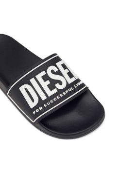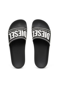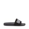 מגלשות גומי עם מיטות רגליים מעוצבות וסוליות אחיזה. לוגו ממוסגר מנוגד מוטבע על הרצועה הרחבה.