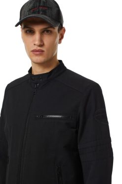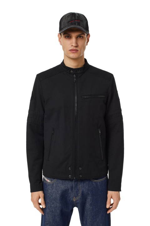 מעיל אופנוענים בגזרה רגילה, מעודכן במבנה אריג כותנה מעורבת למראה מרקם. הצללית הנקייה שלו כוללת צווארון כפתור הצמד ומכווני מכפלת עם אבזמים, עם תיקון ד אובלי על כל שרוול.