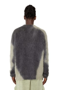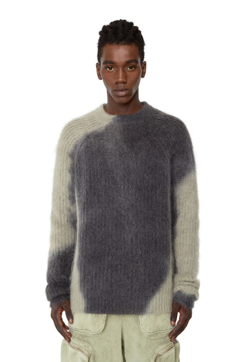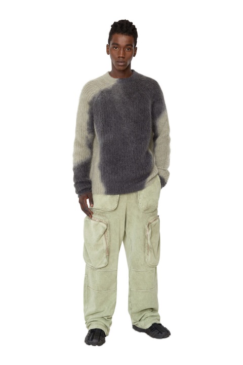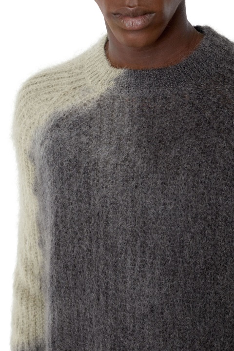 מגשר לגברים משוחרר בצללית, עם פסים של צבע בהיר יותר בשרוולים ובצדדים כמו מתהליך הצביעה הכפולה. הוא סרוג בצלעות מתערובת אנגורה ומוברש כדי לשפר את התחושה הרכה והמטושטשת.