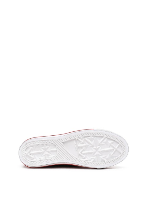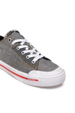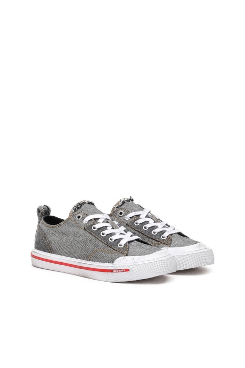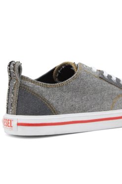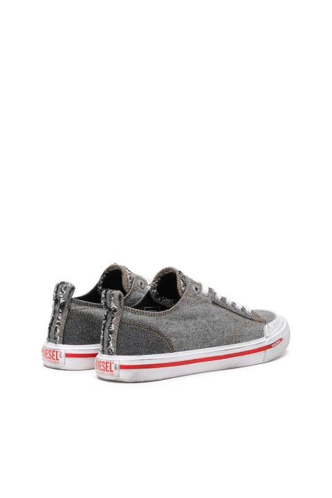 נעלי ספורט נמוכות לגברים בעיצוב “בפנים החוצה”, עשויות מפאנלים של ג’ינס שחור הפוך. החלק העליון מוצב על סוליית גומי במצוקה, עם קצוות משופשפים ותפירת טבק.