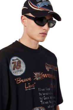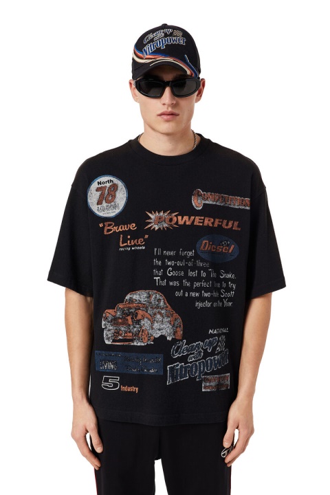 חולצת טריקו רפויה זו כוללת תערובת של הדפסי מרוצי דיזל מגומיים על החזה. הוא שטוף אבן ומטופל בחול לאפקט וינטג’.
