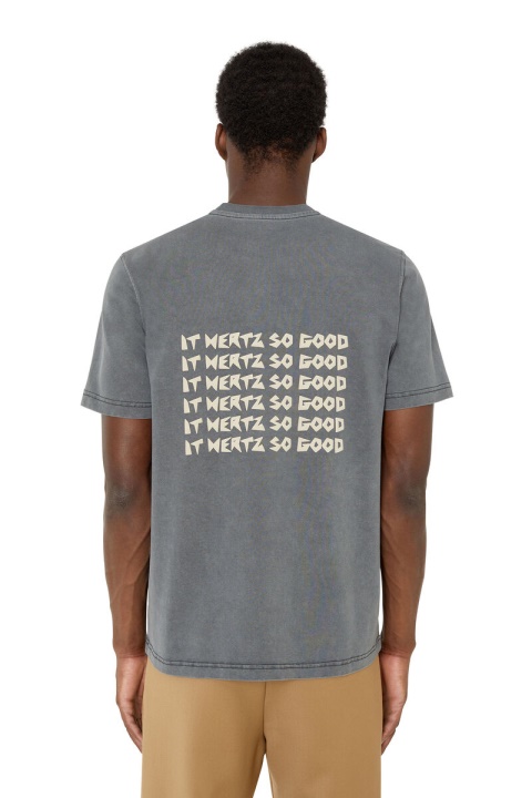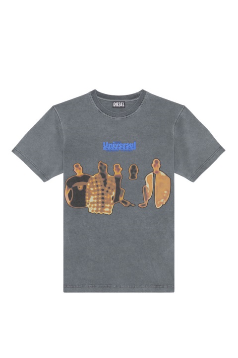 גזרת טי לגברים בגזרה רגילה מג’רזי כותנה שחורה, מטופלת ומרוססת למראה דהוי. החזה מודפס עם לוגו ‘Disel Universal Movement’ מגומי וגרפיקה של סורק תרמו דיגיטלי. כיתוב בהדפסה נפוח מעט את הגב.
