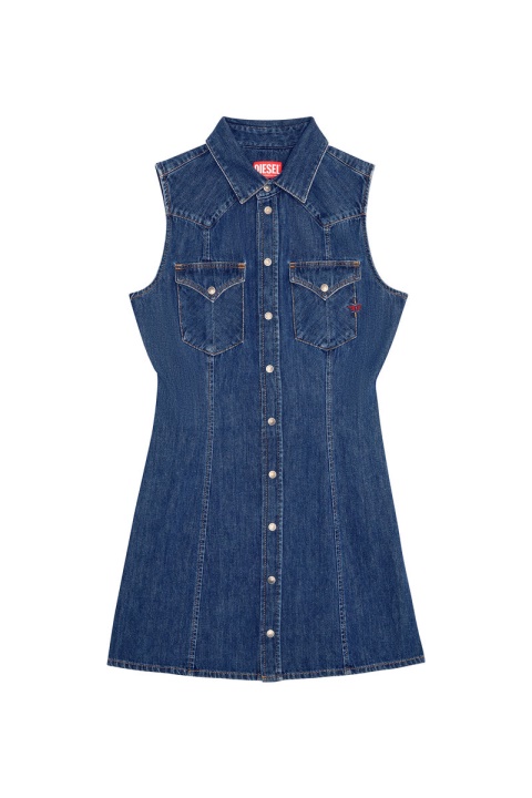 השמלה הקצרה הזו ללא שרוולים עשויה מג’ינס כותנה, היא כוללת צללית מערבית מותאמת ורקמת לוגו אדום על כיס החזה.