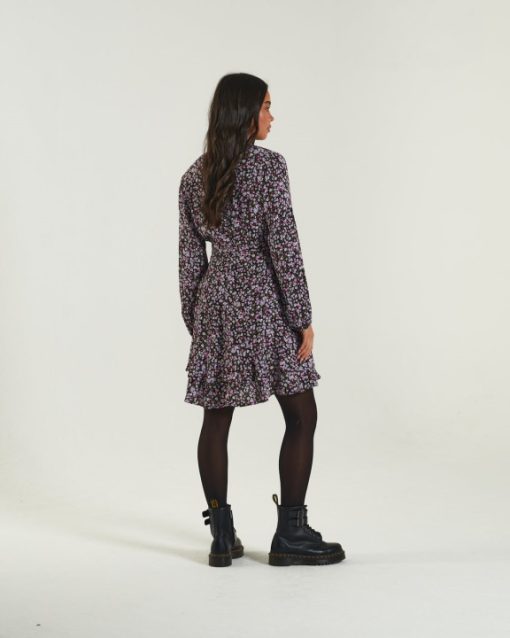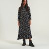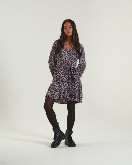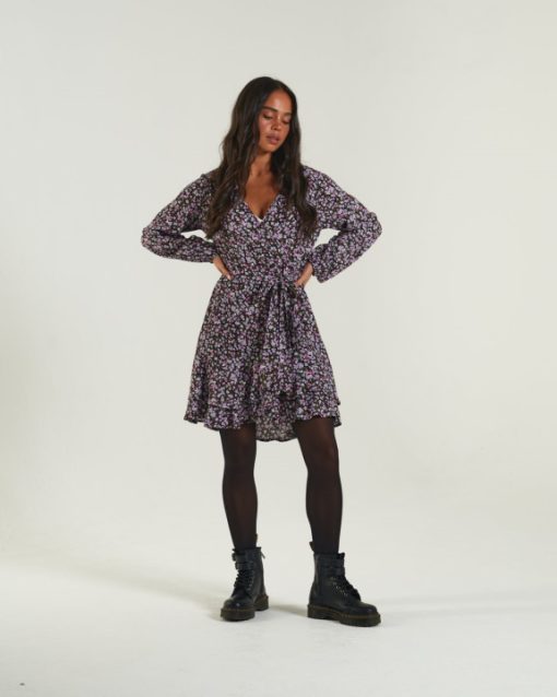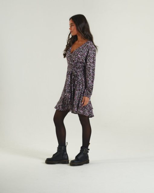 שמלה נוסח מעטפת ויסקוזה מודפסת עם חצאית מסולסלת וחפת אלסטי. קשור בחגורת בד ומסיים עם תג מתכת דיזל במותניים. הדוגמנית לובשת מידה XS. בגד זה מתאים למידות. 90% ויסקוזה, 10% משי