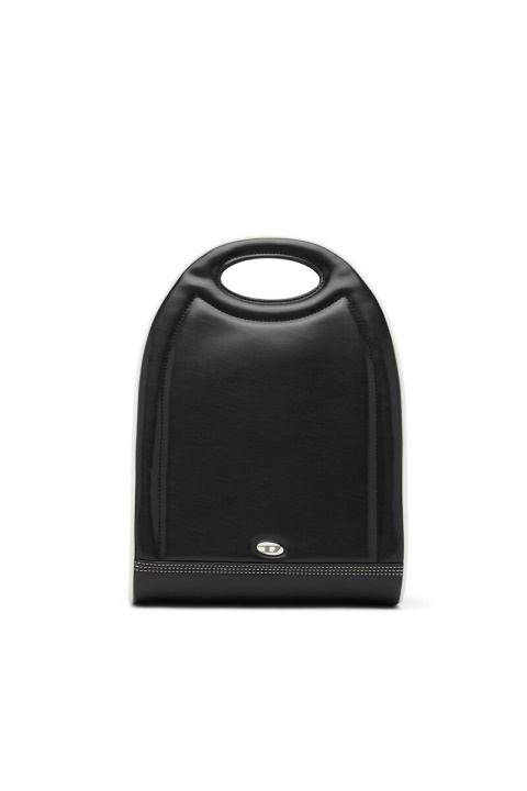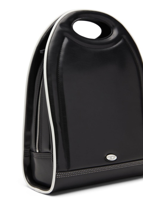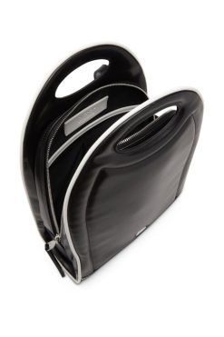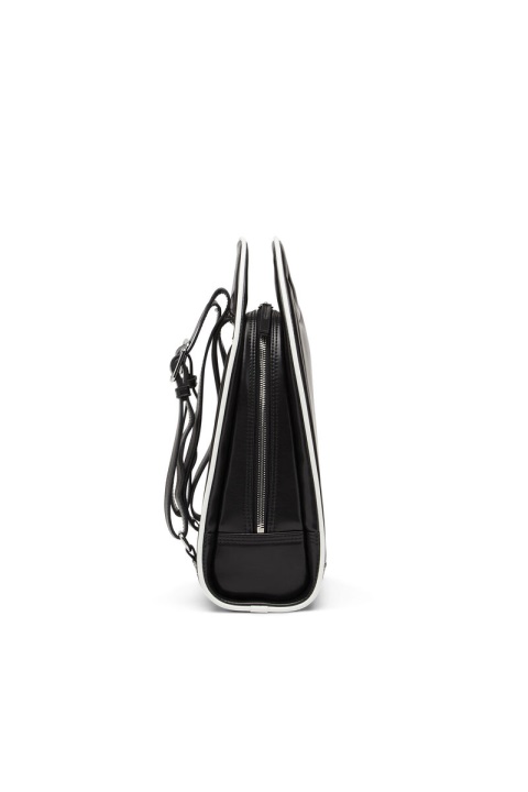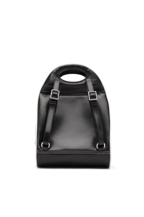 תיק גב לנשים בפוליאוריתן ממוחזר שחור. מאופיין בצורת חצי ירח המעוגלת ובידית הגזורה, החלק המובנה הזה מפורט עם לוח לוגו אמייל, צנרת לבנה ותפרים משולשים מחזקים. החלק הפנימי מרופד בבד ממוחזר.