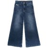 סגנון רחב עם מותניים רגילות ורגל מתרחבת. הצללית הלא שגרתית עם דיטיילים מינימליים היא מודרנית ונשית. השטיפה בתכלת עשויה מג’ינס נמתח, מציגה מראה נקי עם טיפולים בעבודת יד לגימור ניואנסים.