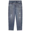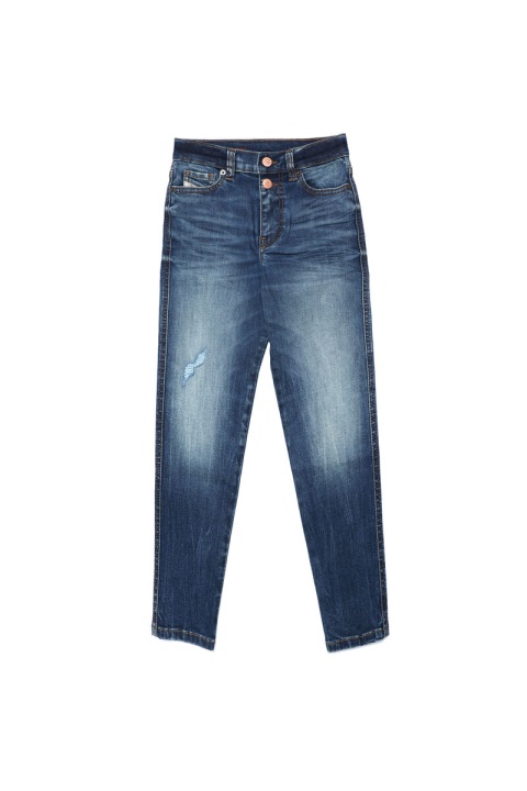 סגנון ישר עם מותניים רגילים ובניית “אמא ז’אן”. עשוי מג’ינס נמתח בכביסה כחולה בינונית אותנטית וחיה עם שפם תלת מימד ופרטים שבורים ומתוקנים.
