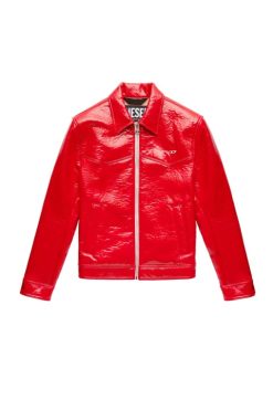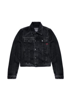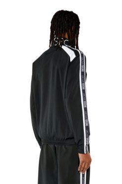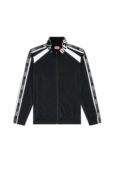 ז’קט טרנינג שחור לגברים מבית DIESEL SPORT Edit, בנוי מג’רסי טכני מנדף זיעה. מעוצב עם סרט לוגו על השרוולים וכיתוב מגומי על צווארון המעמד. לוגו ‘ד’ מגומי מעט את החזה.