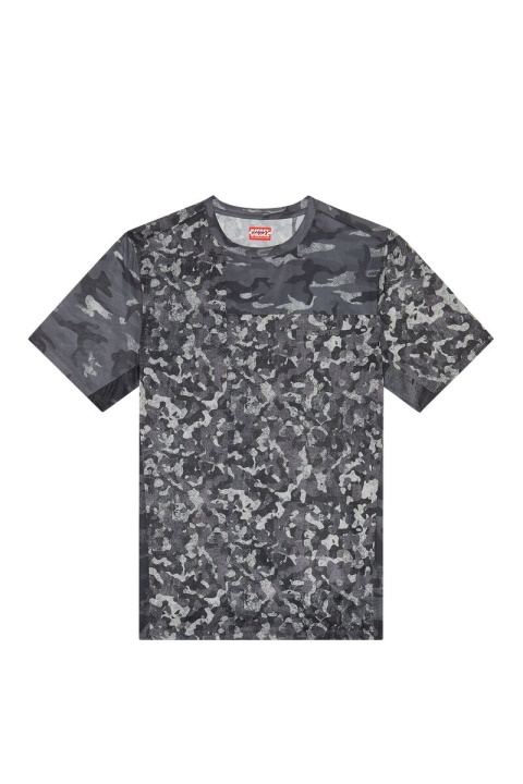 חולצת טי DIESEL SPORT לגברים מבד מנדף זיעה. זה מורכב מדפיסי קאמו מנוגדים למראה טלאים, הוא מפורט עם אייקונים מחזירי אור ולוגו ‘D’ מגומי בגב.