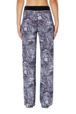 חלק מקולקציית FW22, מכנסי DIESEL SPORT לנשים אלה חתוכים מבד סריג עיוות נמתח מודפס עם בריקולאז’ של כיסי ג’ינס. יש להם קומה גבוהה ותפרים ללא שפשוף. רצועות המותן והצד המצולעות עם מגע כותנה גמורים בתפירת כיסוי דקורטיבית.