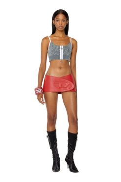 סתיו חורף 2022 קולקציית Runway Show חגורה נמוכה לנשים, לבישה כחצאית מיני קצרה במיוחד. גרסה א זו דומה עשויה מעור חלק, מוטבע בחזית עם סמל ‘סגלגל D’ גדול מדי. הגרסה האדומה של פריט זה היא מהדורה מוגבלת.