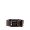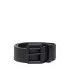 חגורת כחולה גברים עשויה מג’ינס איטלקית ועור אדום, מהודקת באבזם רולר מתכתי. צד הג’ינס מציג דוגמת מונוגרמה בלייזר ותפירת טבק קלאסית.