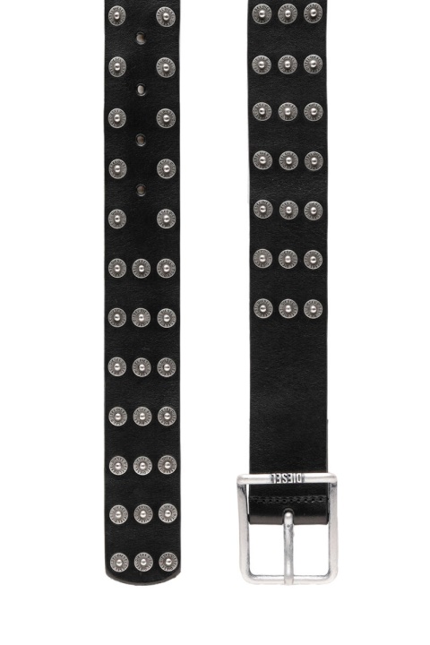 חגורה לגברים זו עשויה מעור שחור עם מסמרות ג’ינס ממותגים ואבזם סיכה כסוף.