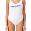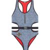 תחתוני ביקיני אלה מעוצבים בהדפס המתאר ג’ינס מונוגרמה כחולה. גזרו מבד נמתח מלוכד עם מוטיב לוגו עגול, יש להם רוכסן קדמי וגב חתוך מהודקים עם אבזם.