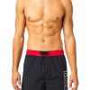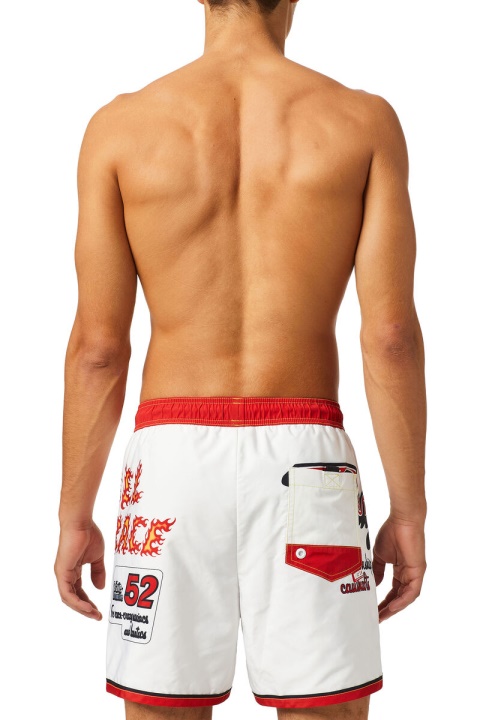 חולצות שחייה בגימור מתבקש במהירות, עשויות באמצעות פוליאסטר ממוחזר מאושר. זוג זה באורך בינוני מעוטר בלוגים בהדפסה דיגיטלי וגרפיקה בהשראת מירוצים.