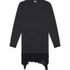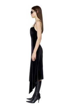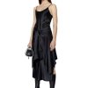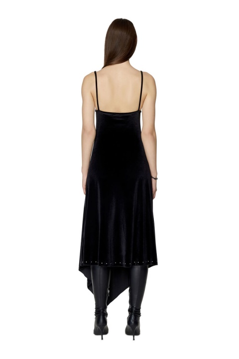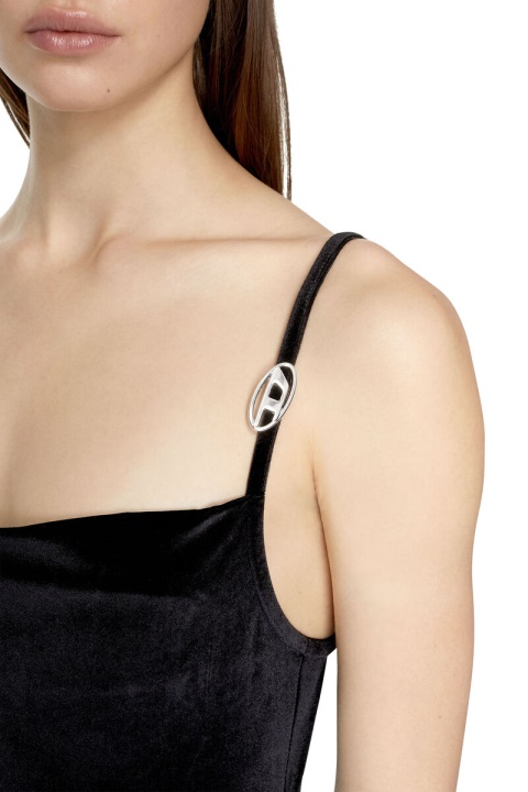 שמלת מידי זו גזורה מקטיפה קטיפה ונמתחת. מנוקד בקריסטלים לאורך המכפלת הציפה והאסימטרית, הוא משתלב דק דרך המחוך ויש לו קו צוואר. לוח לוגו סגלגל מדגיש את אחת מרצועות הכתף.