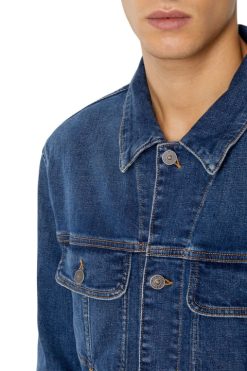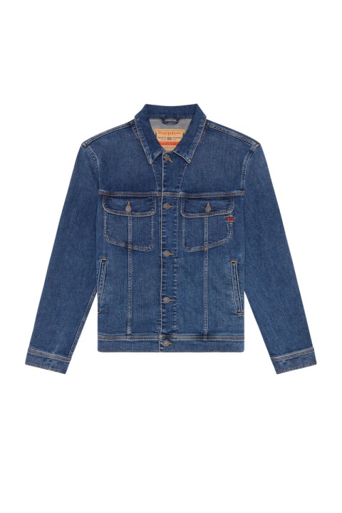 ז’קט משאית לגברים מ-FW22 Runway Show, חתוך להתאמה רגילה עם סגירת רוכסן. הג’ינס הזה הוא Diesel Rehab Denim, בד חדשני המציג גישה יותר. הכביסה עשויה מכותנה ממוחזרים לחלוטין ואלסטן העשויים מבדים קיימים, ומורת גוון כחול כהה עם אפקטים מוצללים חיים, שפים וגי תלת מימדי.
