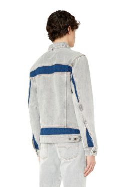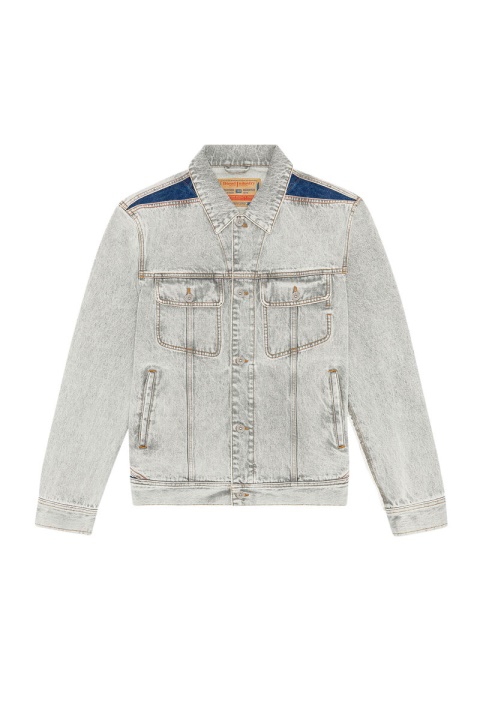 ז’קט ג’ינס לגברים עם צללית בגזרה רגילה. העיצוב המחובר נותן לו מראה דו-גוני. יוצר מכותנה אורגני, כביסה דו-צבעונית זו משלבת טלאי ג’ינס בצבע אפור בהיר וכחול, תפורים ושטופים יחד. תפרים צבעוניים מנוגדים מדגישים את המבנה המיוחד של היצירה.