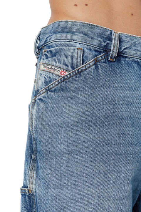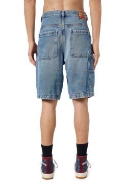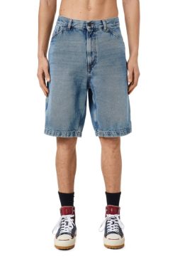 מכנסי ג’ינס קצרים עם חמישה כיסים מועשרים בכיסי צד בהשראת שימוש ברגל ימין. הם נחתכים באורך הברך וכלים תפרים משולשים מחזקים בין והעול האחורי. תיקון ג’ינס זה מעביר מראה אותנטי דרך שטיפה כחולה בינונית שעברה טיפול קל.