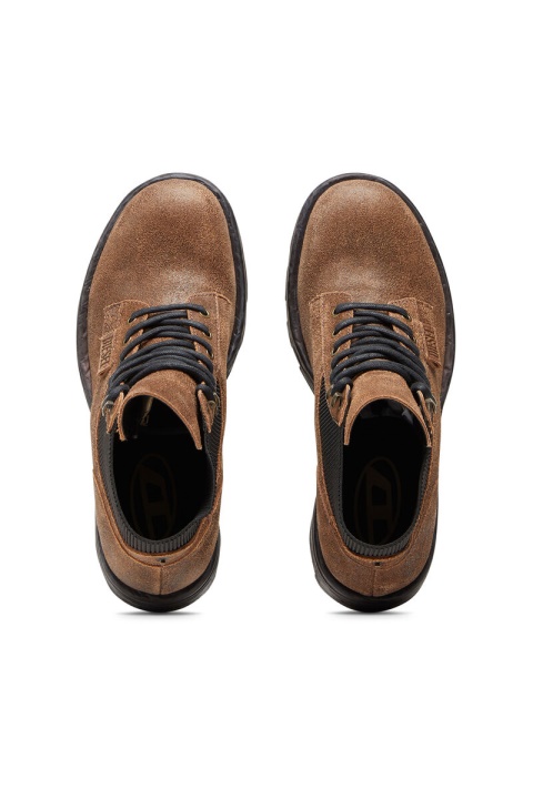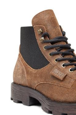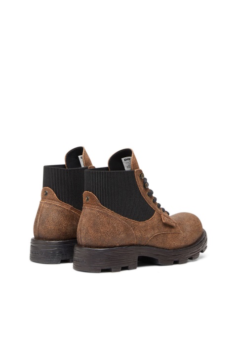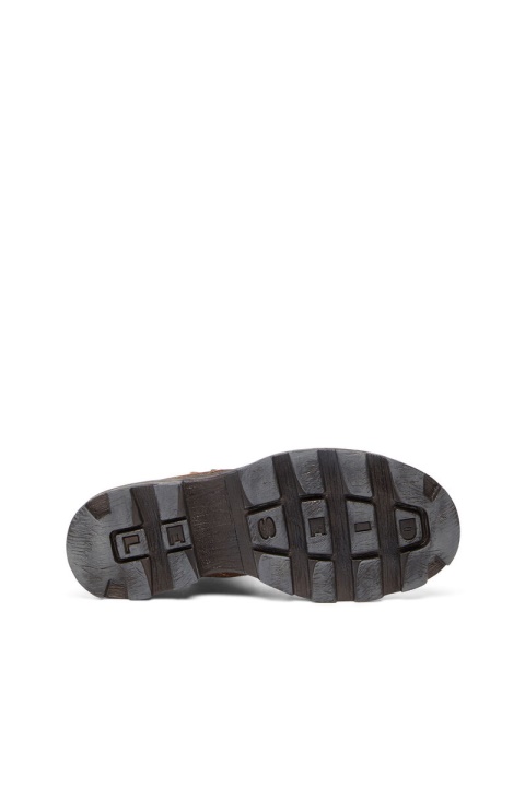 מגפי שרוכים לגברים מעוצבים עם צווארונים נמתחים וסוליות זיזים עבות במיוחד. נעל זווצבת מעור עגל מובחר בגוון חום, ואפשר טיפול סדוק, שרוכים בשעווה וווים עיניים בהשראת טיולים.