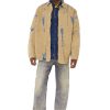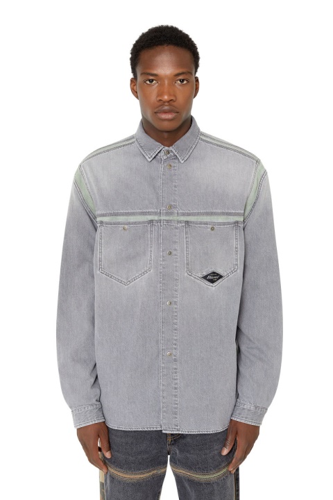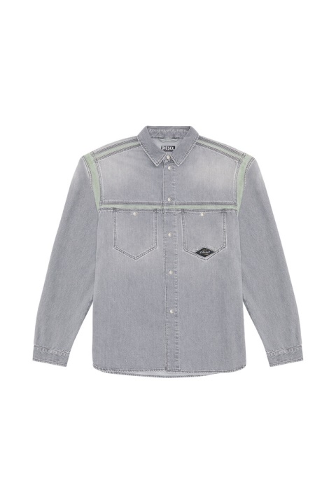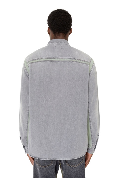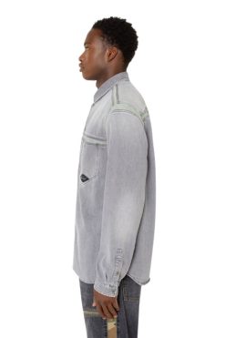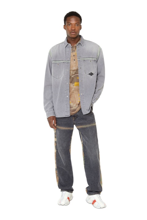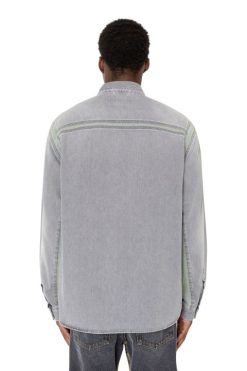 עיצוב ארכיוני ייחודי, חולצת גברים בגזרה רגילה זו עשויה מג’ינס תיקון בגוון אפור בהיר, שחבורה עם תוספות ירוקות-בהירות לאורך התפרים. טיפולים עדינים מקנים מראה שחוק באופן טבעי.