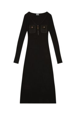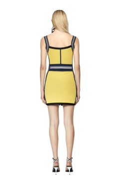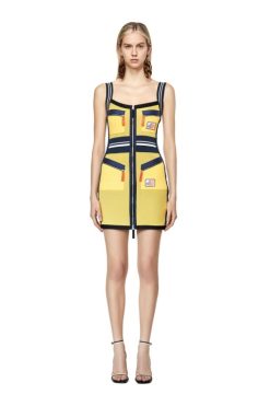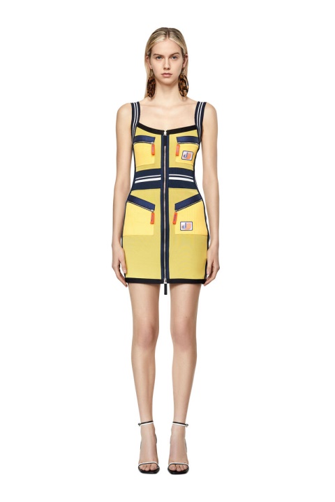 SS22 Fashion Show Collection שמלת רוכסן חתוכה מרשת כוח איטלקית קלה דו-שכבתית, חיבורת כיסים עם רצועות ניילון מרופד וטלאי לוגו. סרט סריג מפוספס ברצועות ובמותניים וכריכה אלסטית מגדירים את הפרופיל הדק שלו.