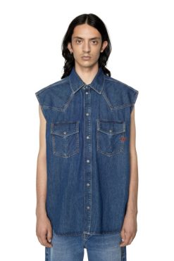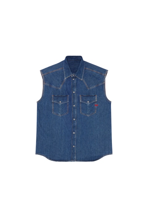 חולצה מערבית לגברים חתוכה לצללית ללא שרוולים. סגנון בכושר רגיל, הוא עשוי מג’ינס כחול פיקס עם עוטים מחודדים וכיסי דש בחזה.