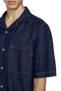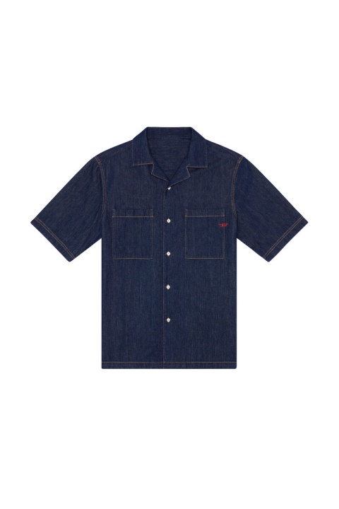 חולצת באולינג לגברים בג’ינס כותנה שטופה כחולה, כוללת צווארון מחנה ושרוולים קצרים. מפורט עם רקמת לוגו D בכיס החזה השמאלי.
