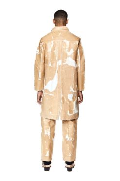 מעיל מכונית ג’ינס בגזרה רגילה עם אפקט פילינג, חתוך עד אורך הברך. טיפול הפילינג-אוף הייחודי שואב השראה מהג’ינס הבלוי של ארכיון דיזל, בגימור בציפוי צבעוני ומוחל על ג’ינס תיקון.