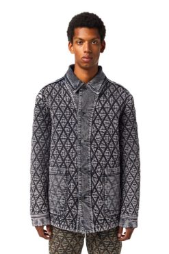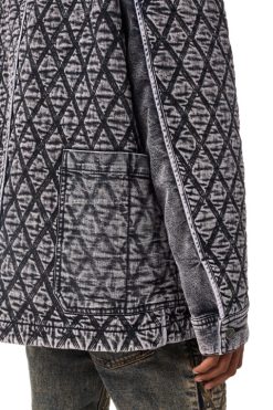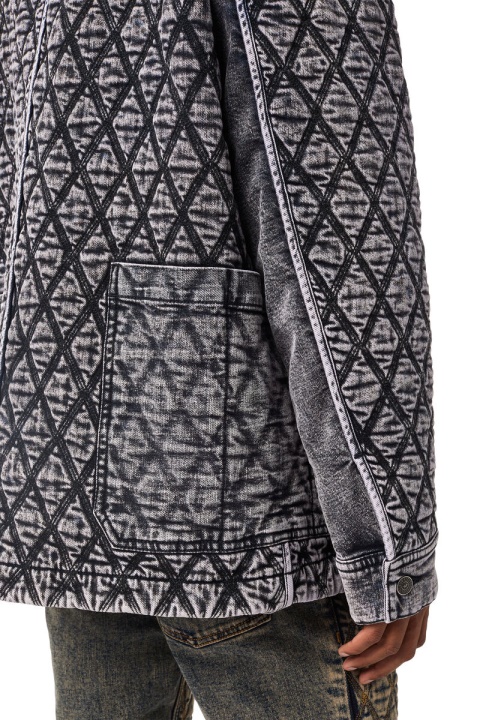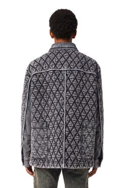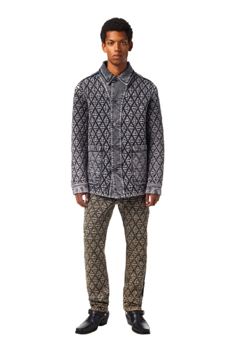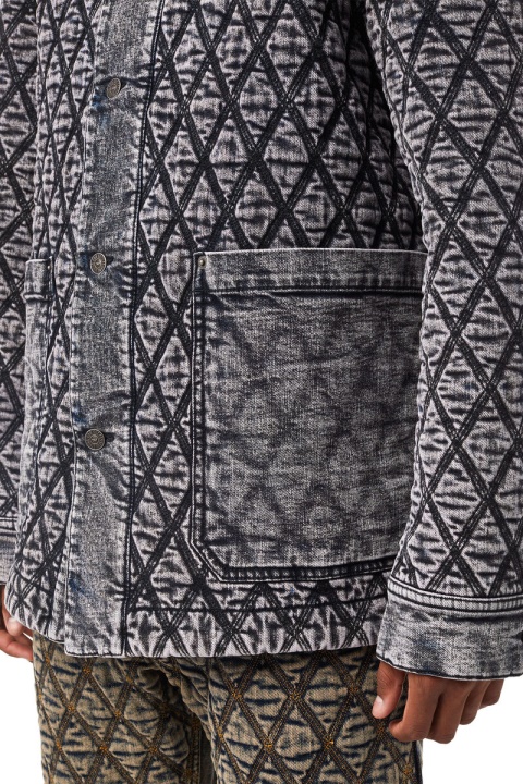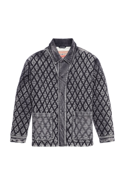ז’קט בכושר קופסא עם צללית של בגדי עבודה הוא חלק מקולקציית תצוגות האופנה SS22. הוא כולל כיסי תיקון מלפנים ומאחור. שטיפת ג’ינס מתיחה מעי בצורה מופתית זו וטיפול שיש חזק בגוונים בהירים וכהים, צבוע יתר על המידה לגי צבעוני. מוטיב Argyle המסורתי תפור על הבד המרופד קלות כדי ליצור גימור מישוש.