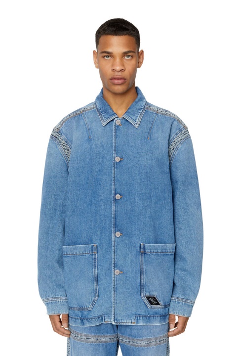 ז’קט בכושר קופסתי עשוי מג’ינס. הצללית בהשראת בגדי עבודה, עם כיסי תיקון גדולים מלפנים ומאחור. ג’ינס מתקן זה כולל גוון כחול בינוני וכביסה מופחתת יותר, המוגדרת ידי שטיפת אבול חלופיים. בניית היצירה מפורטת עם תוספות מונוגרמות אקארד בתפרים.