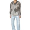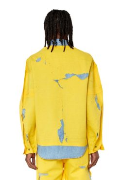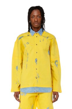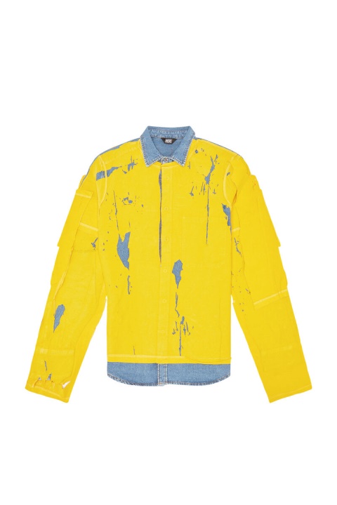 חולצת ג’ינס של קולקציית Runway Show סתיו 22′ לגברים עם אפקט פילינג בג’רזי צבעוני.
