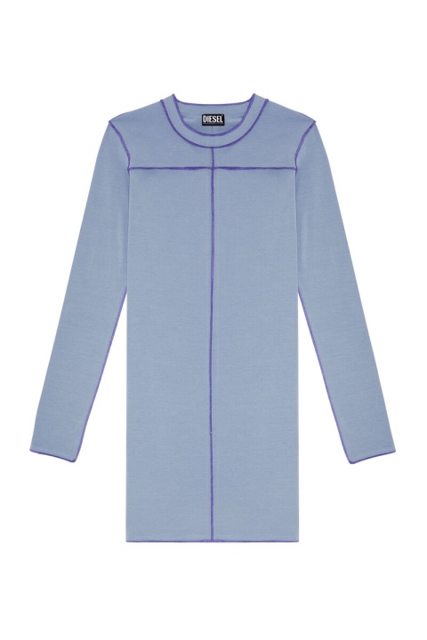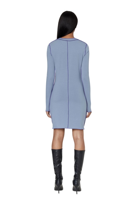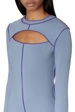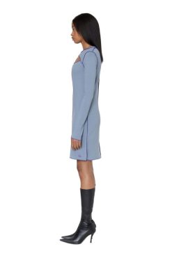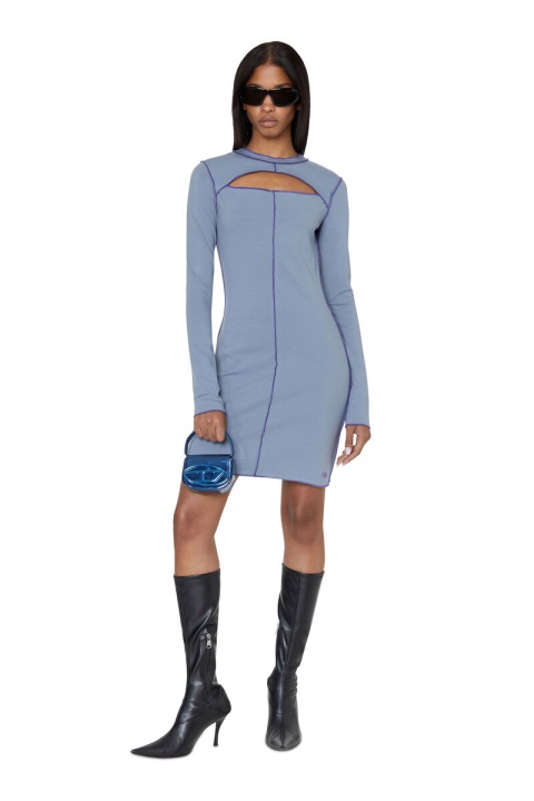 שמלת מיני בגזרה מג’רזי כותנה אורגנית קלה, מעוצבת עם צוואר דומה, חיתוך חזה ושסע בצד. הפרופיל הצמוד שלו מודגש עם תפירת אוברלוק ניגודיות. מותג עם לוגו ד רקום על המכפלת.