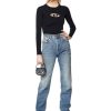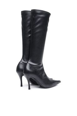 למגפיים לנשים אלו חלק עליון שחור ונמתח, מחוזק בכיסוי עור על הבוהן המחודדת. הצללית שלהם בגובה הברכיים מונחת על עקבותו.