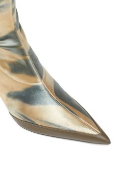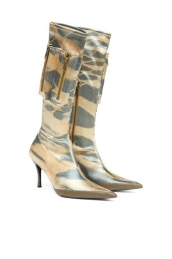 מגפי הטו לנשים הבנויים מסאטן סטרץ’ חלק עם הדפסת הסוואה גרפי. מחוזקת בכיסוי עור על הבוהן, הצללית שלהם עד הברך מתעדכנת בשני כיסים עם רוכסן למראה צבאי.