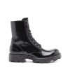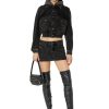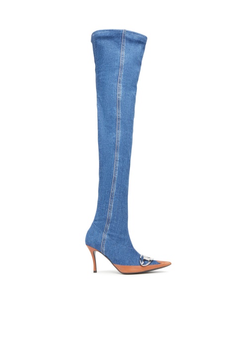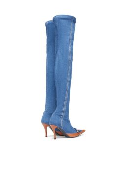מגפיים לנשים בגובה הירך מתחם מג’ינס כחול עם שטיפת אבן, עם בוהן מחודדת בציפוי עור ניגודי. חלק מקולקציית FW Runway Show ’22, הם מצויים עם לוח D אליפסה ממתכת על הבוהן.