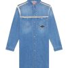 שמלת חולצההת חצאית מקסי מתרחבת ומחוך מותאם עם כיסים בירכיים. מעוצב מג’ינס כחול פיקס שטוף אוזון, עיצוב “בפנים החוצה” זה משלב את החלק הקדמי והאחורי של הבד, ויוצר אפקט דו-גוני בלתי צפוי.