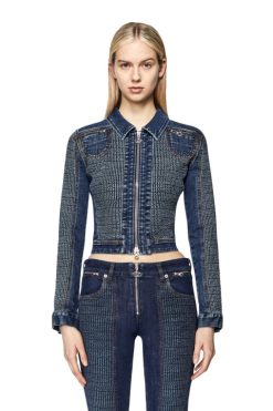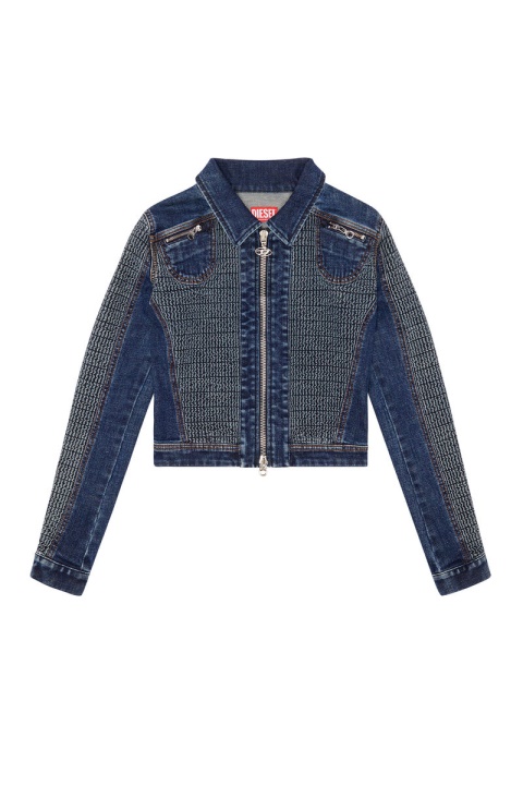 ז’קט בעל מרקם זה כולל התאמה דקה, מעט קצוצה וכיסים מעוקלים עם רוכסן הממוקמים גבוה על החזה. מעוצב מג’ינס מתיחה, כביסה כחולה כהה זו מציגה את אומנות הג’ינס של דיזל. לוחות התפר הגווני תפורים ביד ומרופדים קלות כדי ליצור את האפקט האופייני.