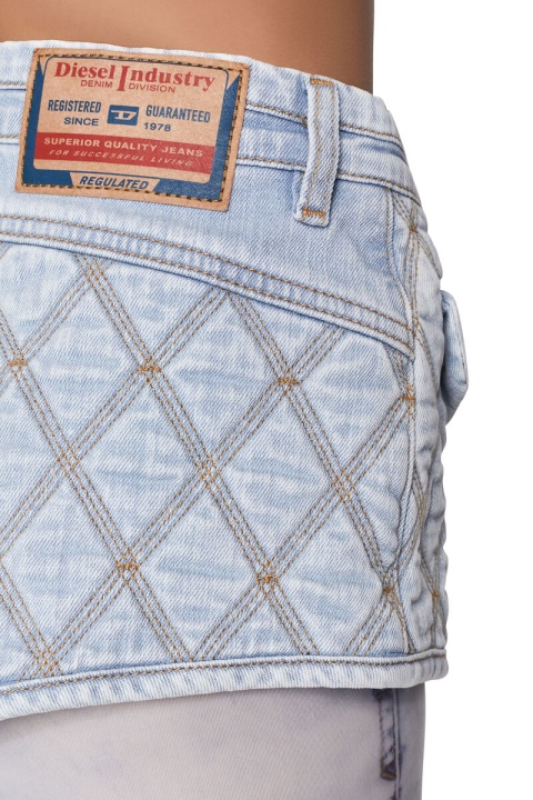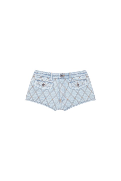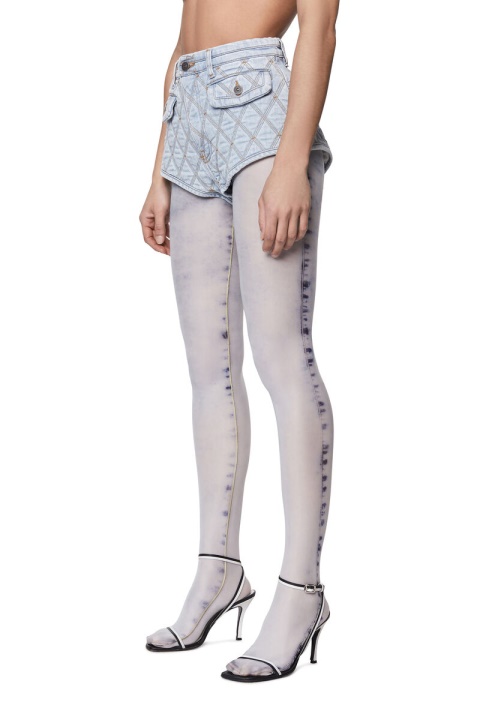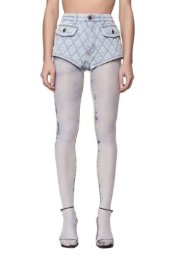 קולקציית תצוגת אופנה אביב-קיץ 22′ מכנסי מותניים גבוהים עם כיסי דש מכופתרים. כביסה ייחודית זו עשויה מג’ינס מרופד קל משקל טיפול בגוונים בהירים וכהים. הוא מועשר בתפרים משולשים שמהנהנים לדפוסי ארגייל וצבוע יתר על המידה עבור מגע של ניגודיות.